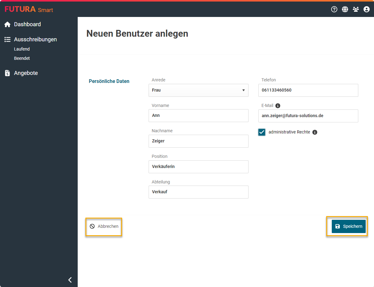 An die hinterlegte E-Mail-Adresse werden nach dem Speichern die Informationen zum Erstlogin und somit Einrichtung des Zugangs in FUTURA Smart zugesendet.