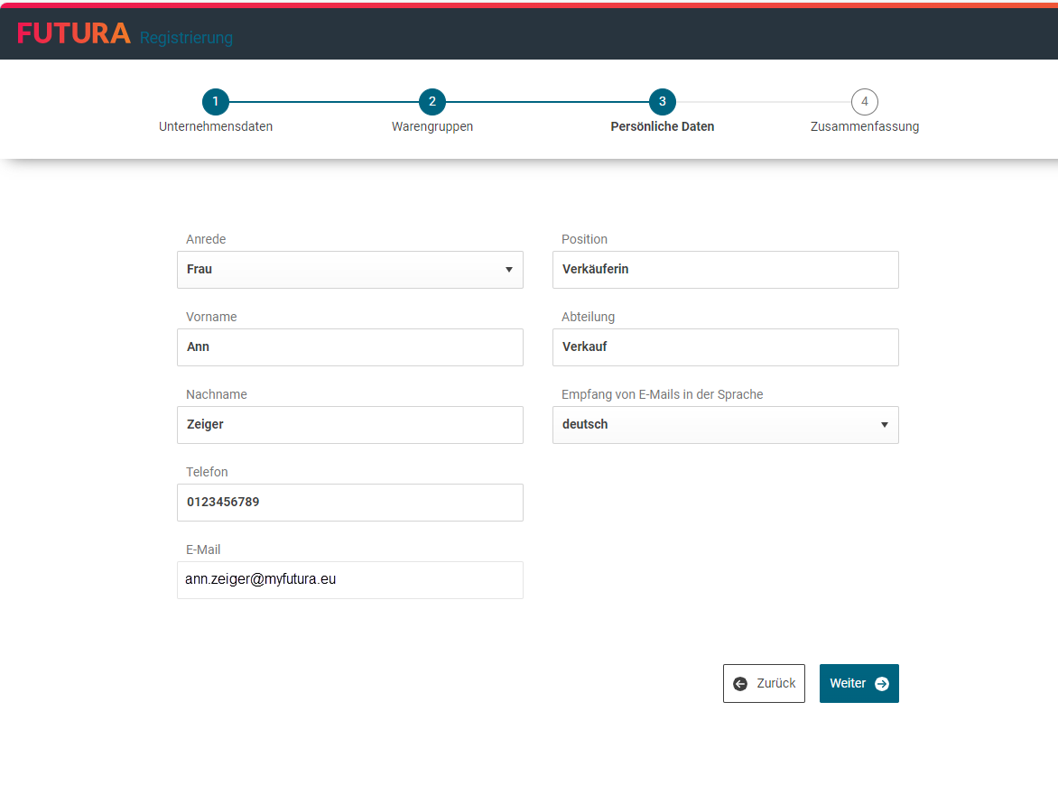 Im letzten Schritt “Zusammenfassung” können Sie nochmals alle Daten einsehen und auf Vollständigkeit überprüfen. Sollten Sie fehlende Angaben finden, können Sie mit dem Button “Zurück” in die jeweils vorangegangenen Schritte zurückkehren.