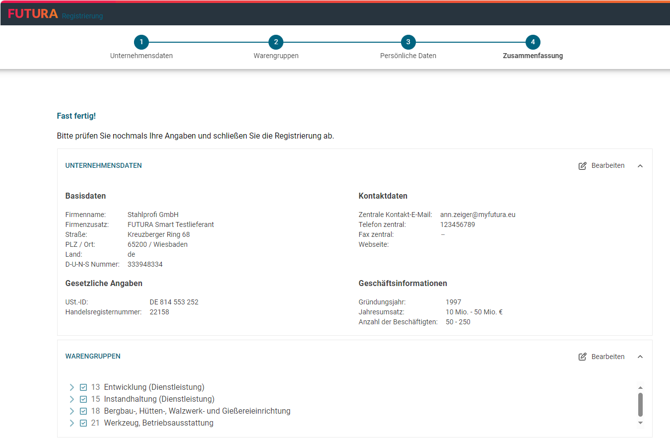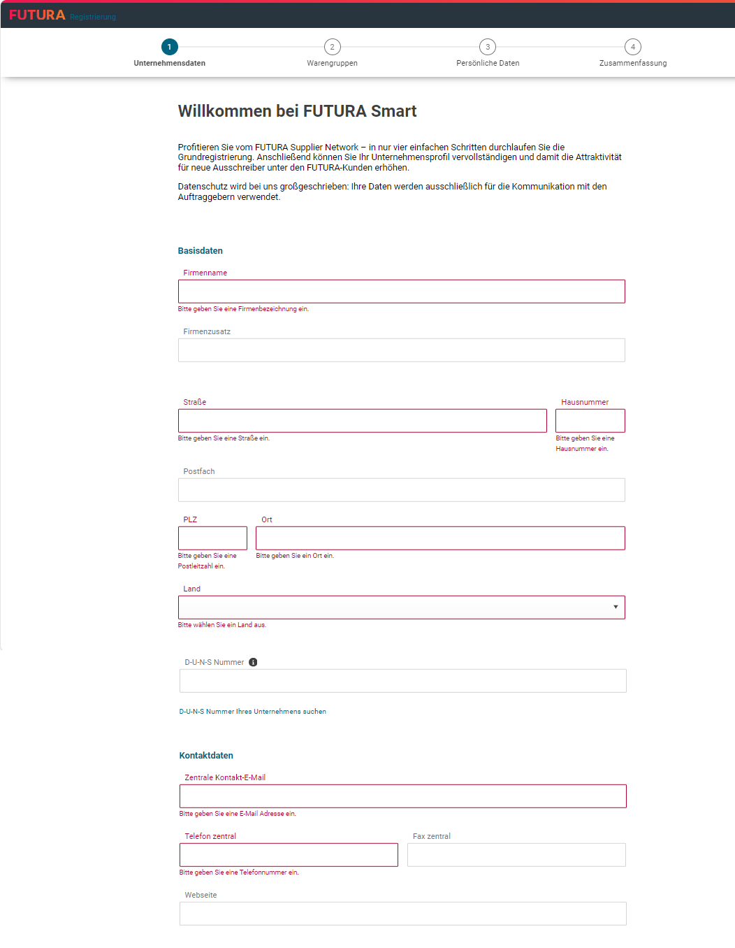 Mit der Veröffentlichung eines Vorgangs seitens eines Unternehmens (das kann z.B. eine Ausschreibung oder eine Informationsanfrage sein), erhalten Sie eine E-Mail, mit der Sie Ihr Unternehmen und den ersten Benutzer für FUTURA Smart registrieren können. Mit einem Mausklick auf den Button Zur Registrierung in der E-Mail, werden Sie zur Registrierung weitergeleitet und beginnen mit der Pflege der Unternehmensdaten. Sie führen damit den Registrierungsprozess in 4 einfachen Schritten durch, der nachfolgend erläutert wird.