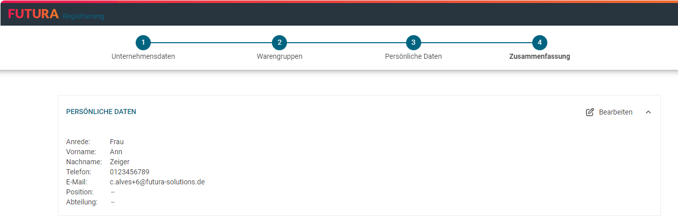 Zusammenfassung der persönlichen Daten im unteren Bereich bei Registrierung