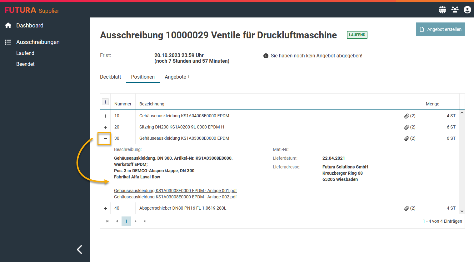 Mit dem Plus- und Minus-Button jeweils links neben den Positionen, können Sie sich die Details anzeigen lassen. Darin enthalten ist die Beschreibung (Langtext), etwaige weitere Anlagen, etc.