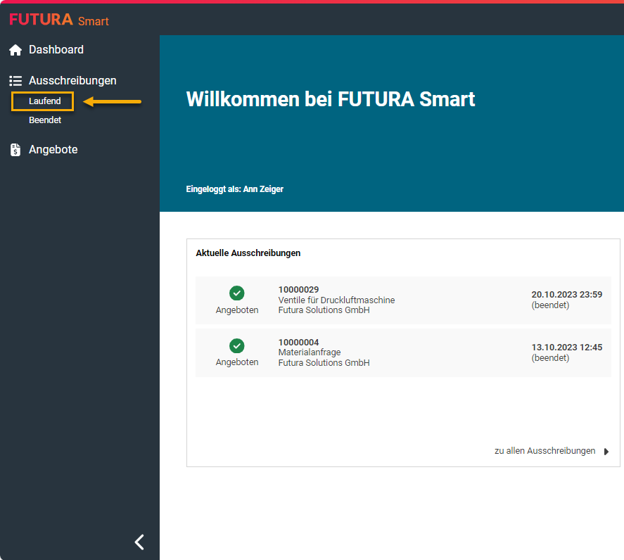 Öffnen Sie auf dem Dashboard auf der linken Seite die Liste der Ausschreibungen durch einen Klick auf Ausschreibungen → Laufend“: