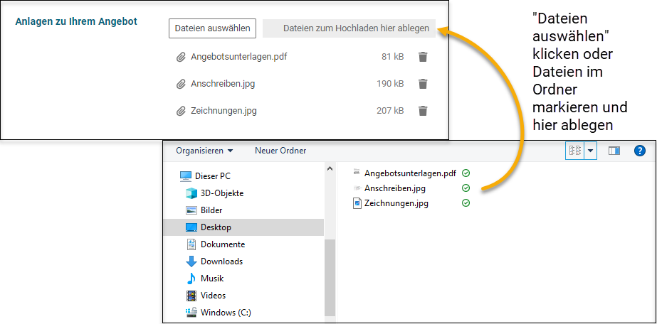 Ihre Angebotsdokumente können Sie unter dem Bereich “Anlagen zu Ihrem Angebot” hochladen. Wählen Sie hierzu den Button “Dateien auswählen” oder markieren und ziehen Sie Ihre Anlagen aus dem Speicherort Ihres PCs und legen diese unter “Dateien zum Hochladen hier ablegen” ab.