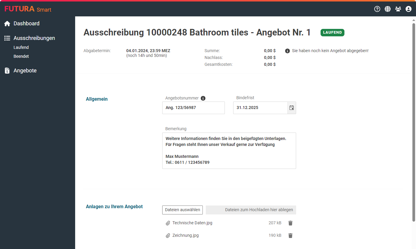 Für die Bearbeitung Ihres Angebots wird eine Eingabemaske für alle relevanten Informationen geöffnet. Hier können Sie nun eine Angebotsnummer und eine Bindefrist für das Angebot eintragen und Anlagen zum Angebot hochladen: