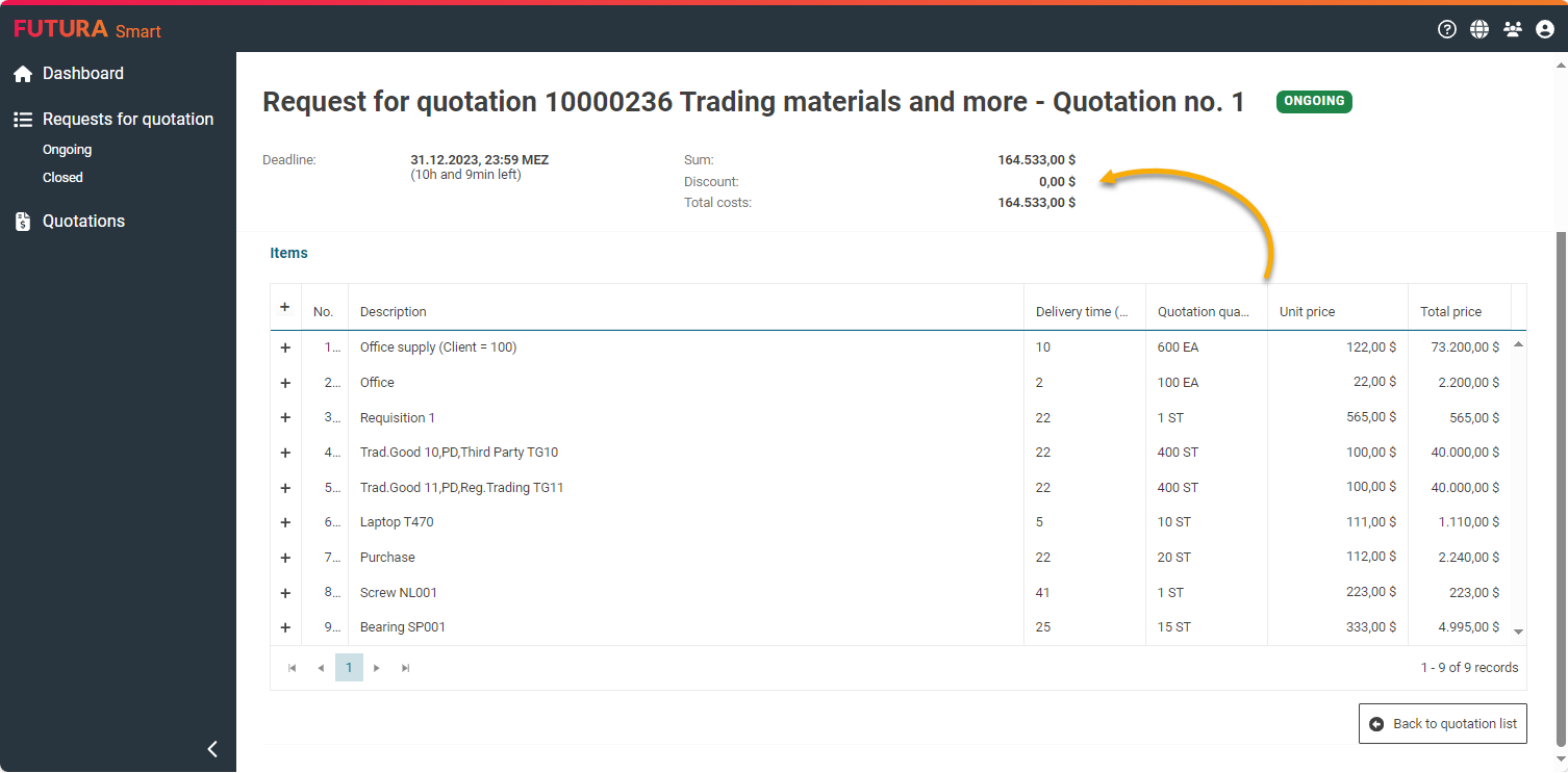 You will find the item list in the lower area. Here, you can enter your quotes. The columns "Delivery time" and "Unit price" can be edited.