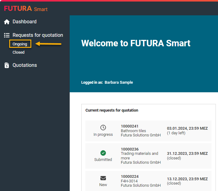On the dashboard on the left, you can open the list of requests by clicking on Requests for quotation → Ongoing":