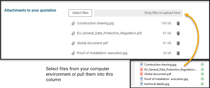 Vous pouvez télécharger vos documents dans la section " Annexes pour votre offre ". Pour ce faire, cliquez sur le bouton "Sélectionner des documents" ou sélectionnez et faites glisser vos annexes à partir de l'emplacement de stockage de votre PC et enregistrez-les sous "Déposer des documents à télécharger ici".
