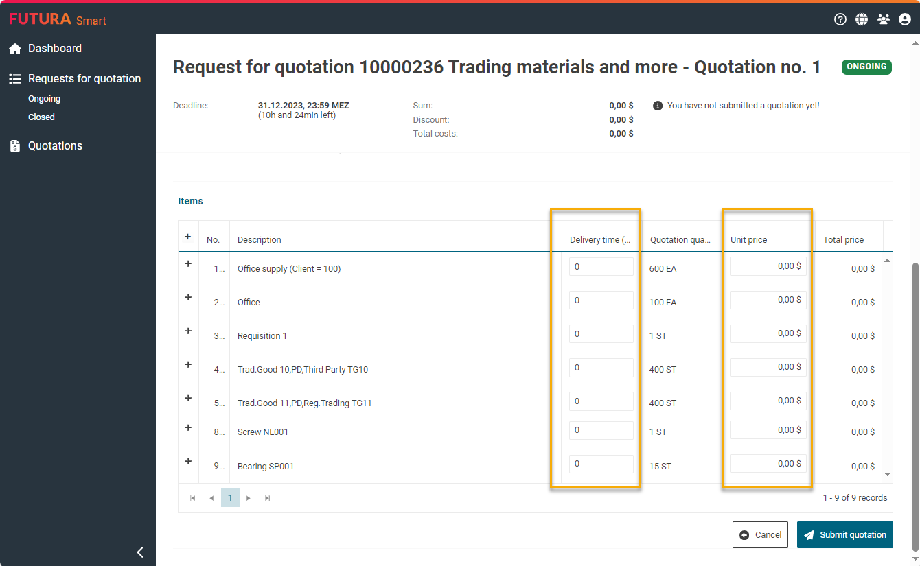Vous trouverez la liste des postes au bas de l'écran. Vous pouvez y introduire vos devis. Les colonnes "Délai de livraison" et "Prix unitaire" peuvent être modifiées.
