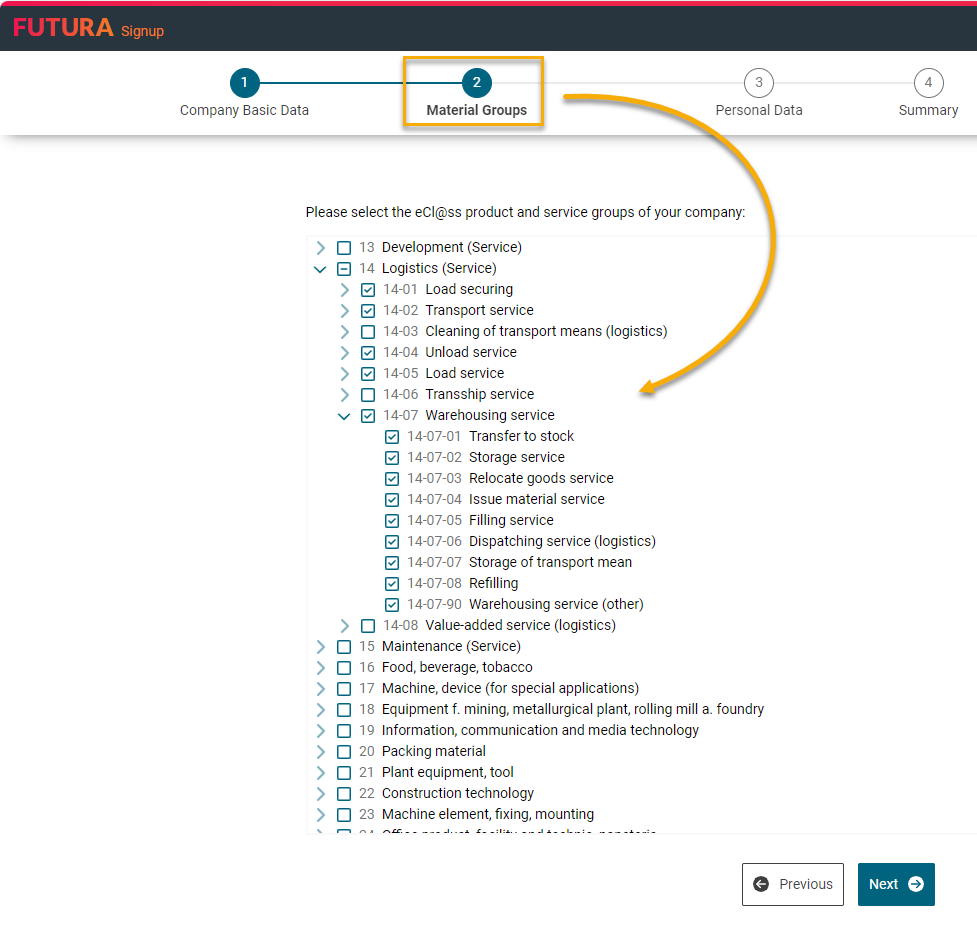 A questo punto, cercate i gruppi di prodotti e servizi ordinati per eCl@ss per i quali la vostra azienda è specializzata. Si noti inoltre che alcuni gruppi di prodotti hanno ulteriori sottogruppi. Espandeteli con il pulsante a forma di freccia e fate la vostra selezione di conseguenza.