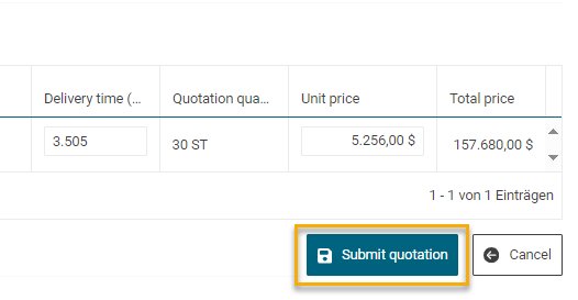 Er wordt een gegevensinvoerscherm geopend met alle informatie die nodig is om de aanbieding te verwerken. Hier kun je nu prijzen, het offertenummer en de bindende periode voor de aanbieding invoeren en bijlagen bij de aanbieding uploaden.