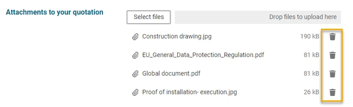 Dokumenty oferty można dodać w sekcji "Załączniki do swojej oferty". Aby to zrobić, kliknij przycisk "Select files" (Wybierz pliki) lub wybierz i przeciągnij załączniki z miejsca przechowywania na komputerze i zapisz je w sekcji "Drop files to upload here" (Upuść pliki do przesłania tutaj).